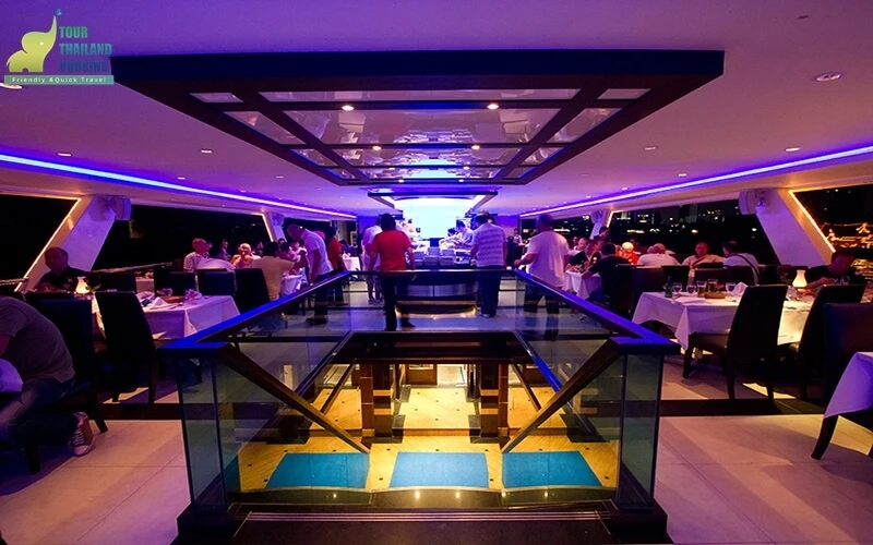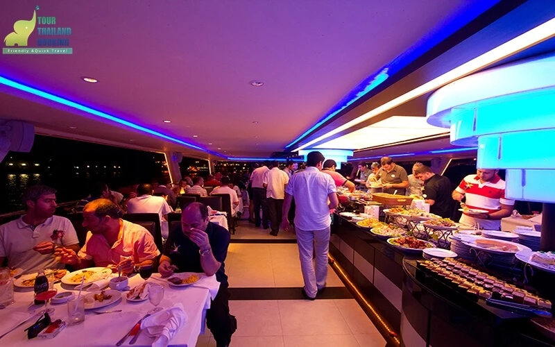 แต่ละชั้นจะมีไลน์อาหาร ให้ลูกค้าได้เเลือกรับประทาน อย่างไม่อั้นตามใจชอบ  ทั้งรายการอาหารหวานคาว ผลไม้ โคลคัท มีมากกว่า 30 ชนิด รวมทั้งชาและกาแฟก็รวมอยู่ในค่าบริการ หากลูกค้าต้องการ เครื่องดื่มแอลกอร์ฮอล์จะไม่รวมในราคา รถชาติอาหารก็แบบกลางๆ เพราะเรือมีลูกค้าเป็นต่างชาติจำนวนมาก