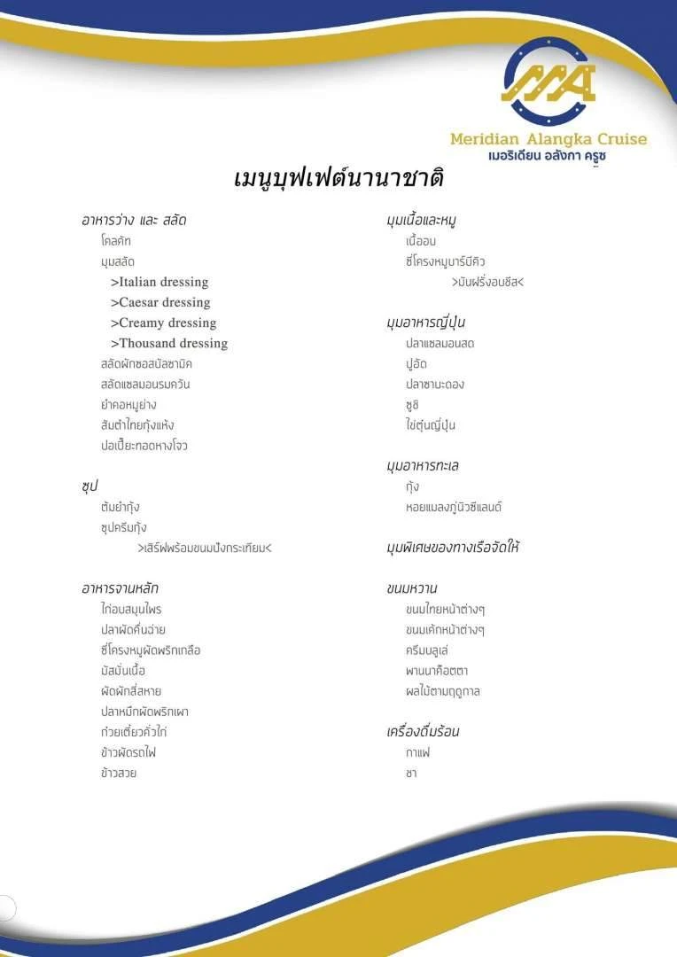 โปรแกรมอาหารค่ำ (Dinner) เรือเมอริเดียน อลังกา ครูซ (Meridian Alangka Cruise)