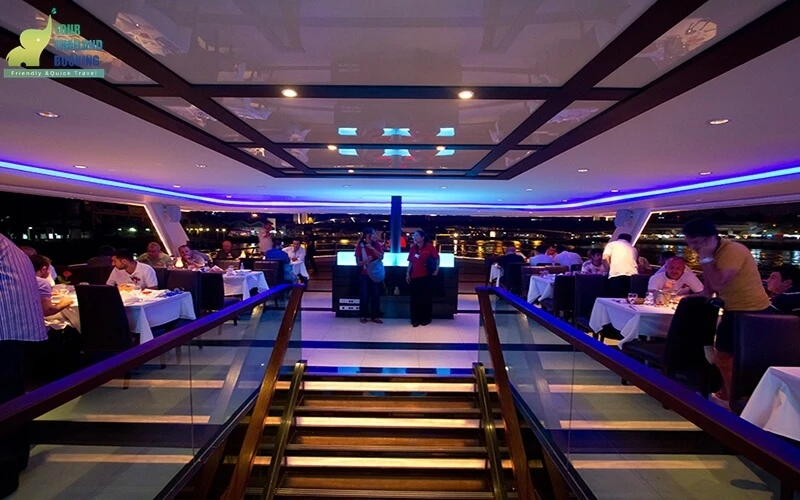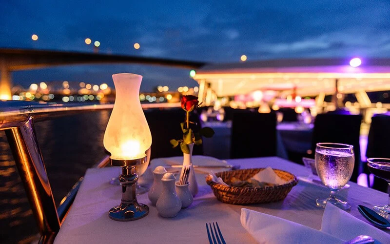 20.30 น. เวลาสำหรับความอร่อยกับอาหารบุฟเฟ่ต์นานาชาติเลิศรส + ซีฟู้ด บุฟเฟ่ต์ ดินเนอร์ พิเศษ open bar (Whisky ,Beer,wine) soft Drinks (Coke,Fanta,sprite) ภายใต้ความโรแมนติคของแสงเทียนและเสียงเพลงสากลที่ท่านชื่นชอบโดยนักร้องเสียงเสน่ห์จากฟิลิปปินส์ ตื่นตาตื่นใจกับความสวยงามของสถาปัตยกรรมสองฝั่งแม่น้ำเจ้าพระยา ในมุมมองที่ท่านอาจมิได้สัมผัสบ่อยนัก อาทิเช่น วัดกัลยาณมิตร วัดอรุณราชวราราม วัดพระแก้ว สะพานพระราม 8 พระราชวังบางขุนพรหม และสถานที่สวยงามต่างๆ อีกมากมาย ที่จะสร้างความประทับใจมิรู้ลืม ตื่นตาตื่นใจ ชมการจุดพลุ จากทั้งสองฝั่งแม่น้ำเจ้าพระยา