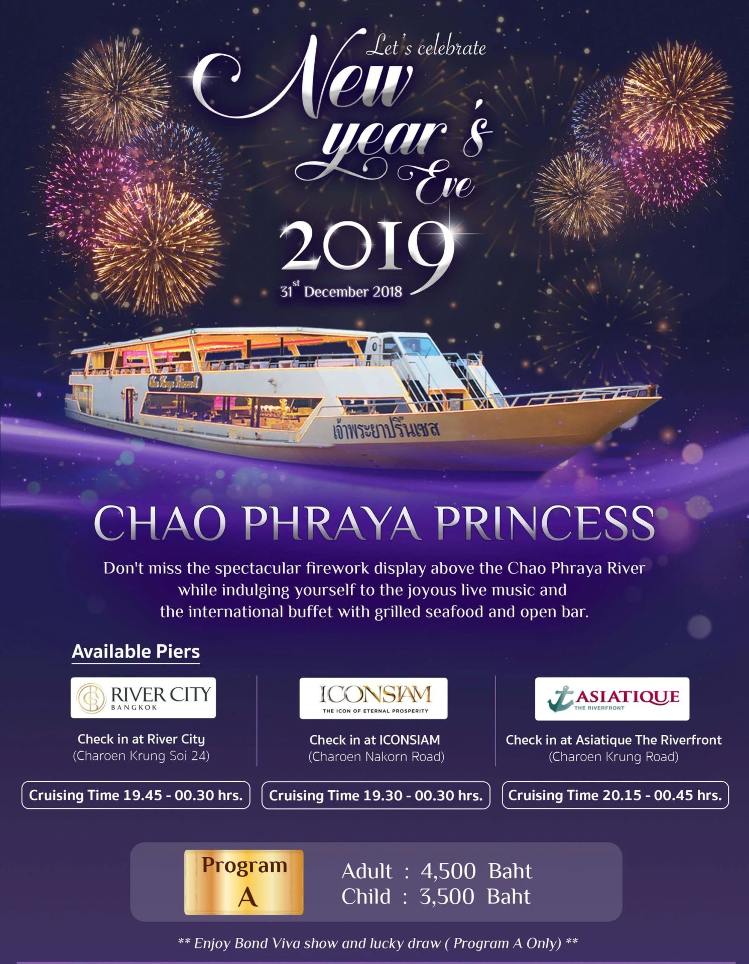 ดื่มด่ำกับบรรยากาศโรแมนติกบนเรือสำราญหรูขณะล่องเรือชมความงดงามของสองฝั่งแม่น้ำเจ้าพระยา อิ่มอร่อยกับดินเนอร์บุฟเฟต์ รับชมการแสดงศิลปวัฒนธรรมไทย ฟังเพลงอันไพเราะเพลิดเพลินตลอดเส้นทาง พร้อมกับร่วมฉลองส่งท้ายปีเก่าต้อนรับปีใหม่และชมดอกไม้ไฟที่สวยงามตระการตา