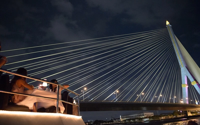 เวลา 20.00 น. | เวลาสำหรับความอร่อยกับอาหารบุฟเฟ่ต์นานาชาติเลิศรส ภายใต้ความโรแมนติคของแสงเทียนและเสียงเพลงสากลที่ท่านชื่นชอบโดยนักร้องเสียงเสน่ห์จากฟิลิปปินส์ ตื่นตาตื่นใจกับความสวยงามของสถาปัตยกรรมสองฝั่งแม่น้ำเจ้าพระยา ในมุมมองที่ท่านอาจมิได้สัมผัสบ่อยนัก อาทิเช่น วัดกัลยาณมิตร วัดอรุณราชวราราม วัดพระแก้ว สะพานพระราม 8 พระราชวังบางขุนพรหม และสถานที่สวยงามต่างๆ อีกมากมาย ที่จะสร้างความประทับใจมิรู้ลืม |