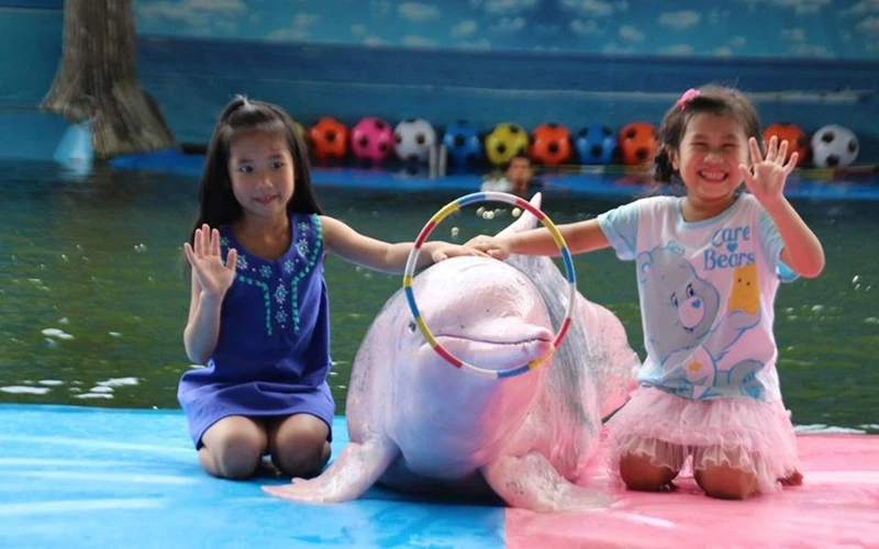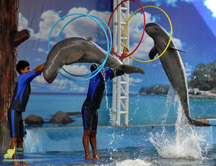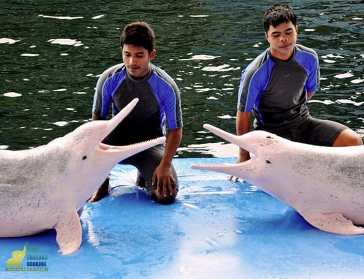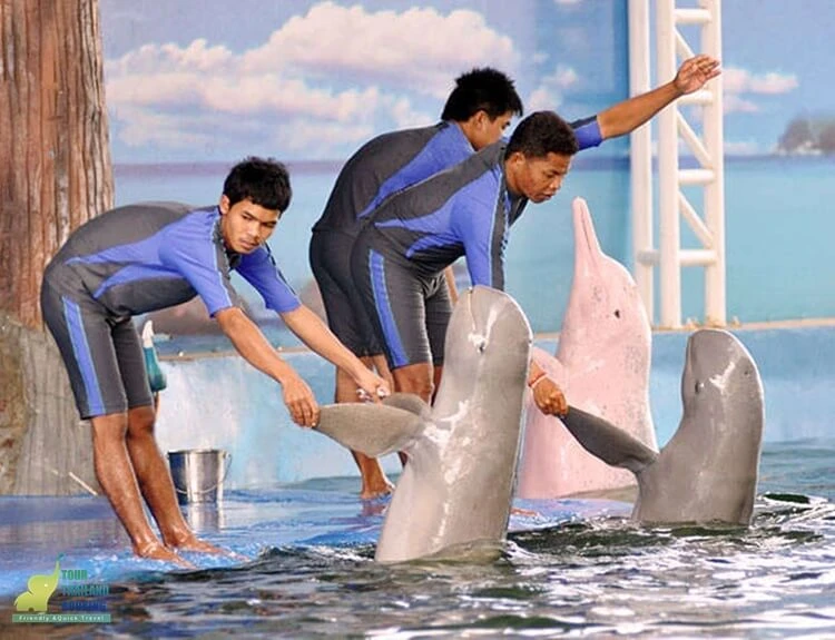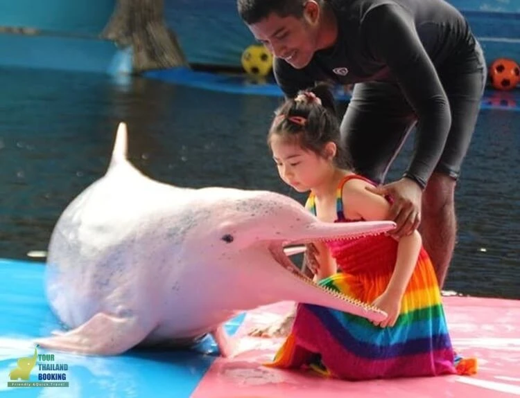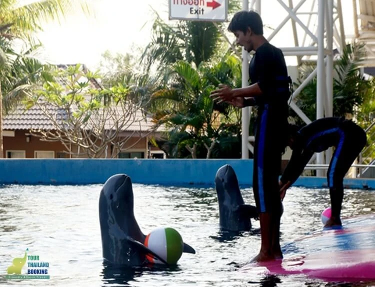 โดยใช้เวลาทำการเล่นน้ำกับโลมาประมาณรอบละ 45 นาที **การเล่นน้ำกับโลมารับได้วันละ 15 คน ต้องโทรมาจองก่อนอย่างน้อย 1 วันที่โทร 038-051-790-6 หรือ 084-6537676 (สายด่วน)**