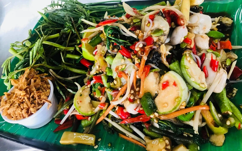 อีก 1 ร้านที่พลาดไม่ได้ สีสันจัดจ้าน สะท้านทรวง กับตำถาด สุดแซ่บ ใช้ช้อนไม่ทันใจ ต้องใช้นิ้วจก เมนูขึ้นชื่อของร้านได้แก่ ตำกุ้งสดถาด, ตำกะท้อนปูม้า, ส้มตำพริกแห้ง, แกงอ่อม ฯลฯ แถมยังมีเมนูอื่นๆ ที่หลากหลายไว้คอยบริการอีกด้วย เช่น จุ่มแซ่บ แจ่วฮ้อน, ยำวุ้นเส้นทะเล, กุ้งแช่น้ำปลา หรือแม้แต่หมูกระทะ ก็มีนะเออ